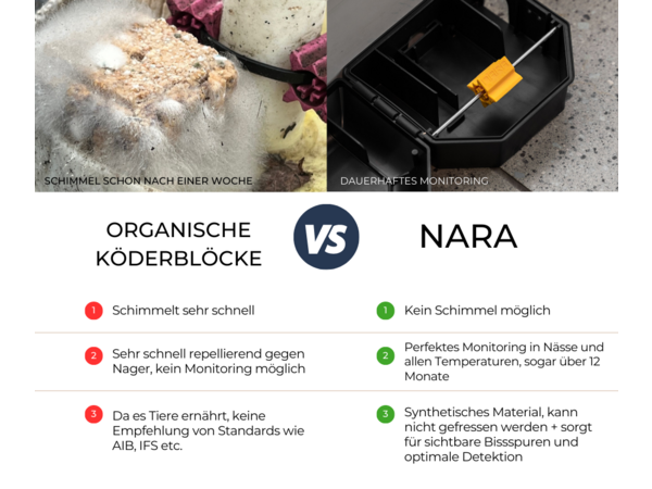 Nara wurde mit und für die Lebensmittelindustrie und professionelle Schädlingsbekämpfung entwickelt. Organische Ködervarianten schimmeln schnell, vor allem, wenn sie mit Wasser oder Feuchtigkeit im Außenbereich in Kontakt kommen, was nahezu unvermeidbar ist. Schon nach wenigen Wochen schimmeln sie stark und sind für Nager nicht mehr attraktiv, sondern das Gegenteil: die Nager werden nie wieder in die Station gehen. Nara kann nicht schimmeln und ist noch nach über einem Jahr ein perfektes Monitoring Tool. Nicht selten zeigt Nara Bloc oder Stic nach über 12 Monaten noch frische Bissspuren bei der Kontrolle. Zudem kann Nara auch nicht von Schad-Insekten gefressen werden, wie durch Käfer, Schaben, Ameisen und weitere.